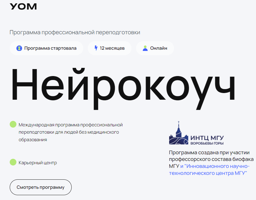 Единственная программа, объединяющая нейробиологию, коучинг и нутрициологию в комплексную систему работы с мозгом. Готовые методики для когнитивного развития и эмоционального баланса — с возможностью применения для себя и в профессиональной практике.login.uom.education
