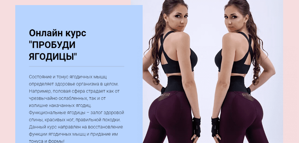 Состояние и тонус ягодичных мышц определяет здоровье организма в целом. Например, половая сфера страдает как от чрезвычайно ослабленных, так и от излишне накачанных ягодиц. Функциональные ягодицы – залог здоровой спины, красивых ног, правильной походки. Данный курс направлен на восстановление функции ягодичных мышц и придание им тонуса и формы!